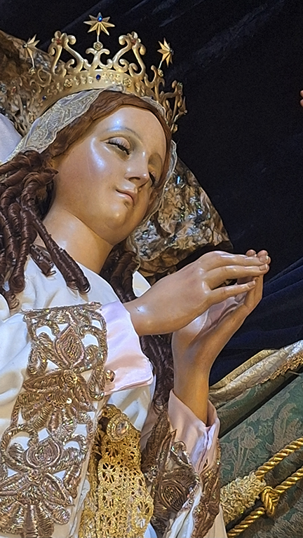 procesionada dentro de su Sacra Urna, a media tarde del siguiente día. Su paso es acompañado por niñas que visten de Angel.