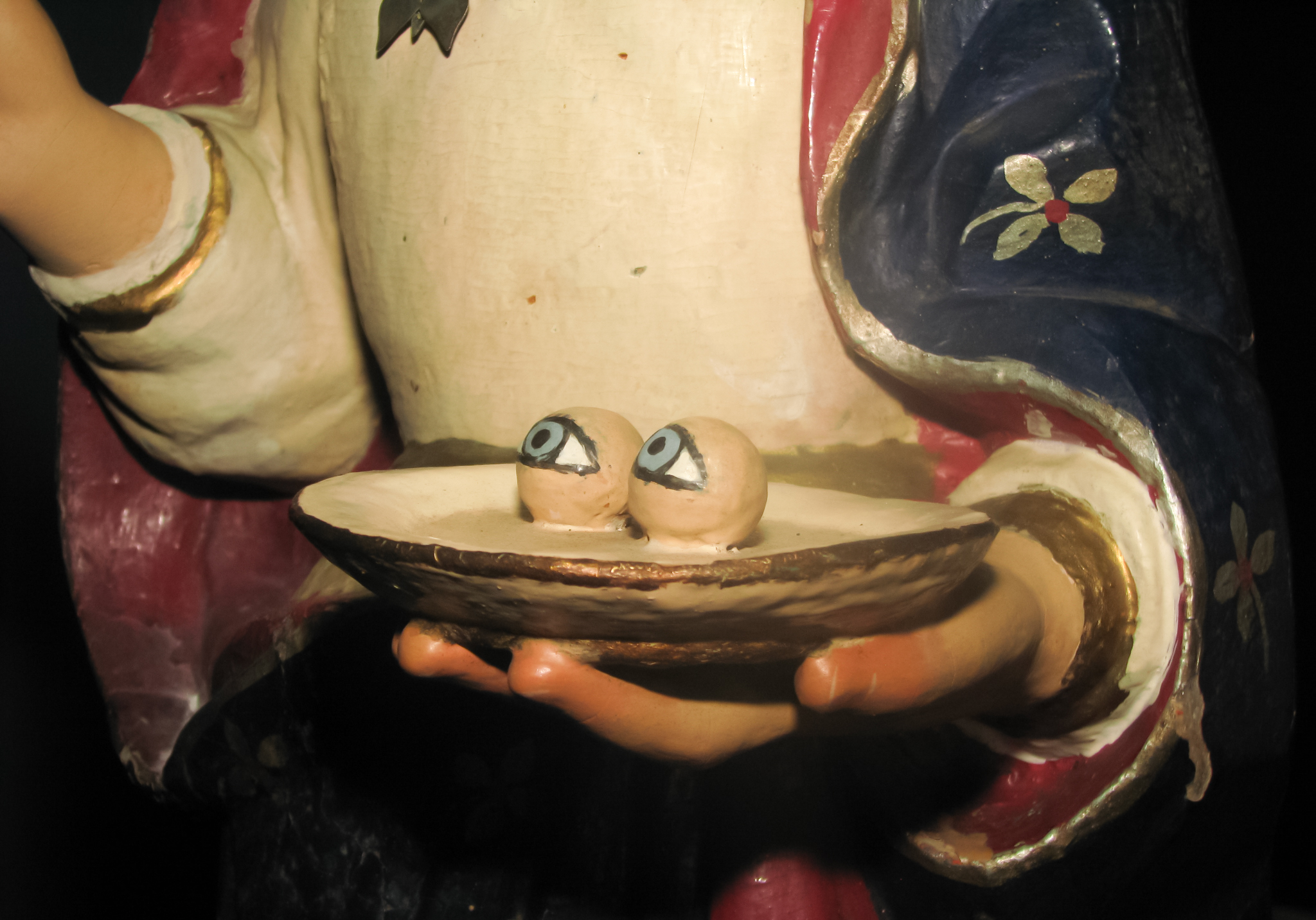 Relata que su insignia sale a demandar las limosnas, pero que antes lo hacía la réplica de la Santa de menor tamaño; agregar que como sucede en muchas otras Cofradías, Santa Lucía es vestida por sus devotos, aunque su talla no lo requiere. En torno a Ella hay testimonios sobre los “favores recibidos”, al someterse a una intervención quirúrgica por una enfermedad de la vista. La Imagen sostiene en su mano izquierda un plato donde yacen 2 ojos. La tradicional visita consiste en que, tras la oración y petición respectiva, se deja un pañuelo blanco en dicho plato; cambian el que tiene la Santa y dejan el que ellos han llevado. Se trata de una ofrenda con el que los creyentes, agradecen la curación de su enfermedad. Narra su Mayordomo: “En cierta ocasión, vinieron unas mujeres desde San Salvador, buscando a "la Virgen"; una de ellas había sido operada de los ojos, pero no hubo buenos resultados. En sueños, oyó una voz diciéndole que fuera a Izalco y buscara a "la verdadera doctora de los ojos". Fue así, como preguntando y con mucha dificultad, logró encontrar este lugar y al entrar suplicó a la Santa por su sanidad. Al año siguiente, el día de la fiesta, vino la misma señora totalmente curada y pasaron muchos años en que no fallaba en visitarla durante la fiesta, pero por cuestiones de edad, la fiel devota falleció”; vienen de todas partes; traen niños y gente mayor… porque Santa Lucía nunca falla, es muy efectiva con los ojos, es la mejor doctora para esas enfermedades… antes, el día de la Vela, la Mayordoma iniciaba el baile que duraba todo el día y parte de la noche. Visitaban a Santa Lucía muchas mujeres refajadas de todos los barrios”.