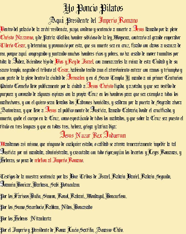 «Copia hallada en la Ciudad de Aqüila, del Reyno de Nápoles, de la sentencia dada por Poncio Pilatos, Presidente de la Judea en el año 18 [sic]