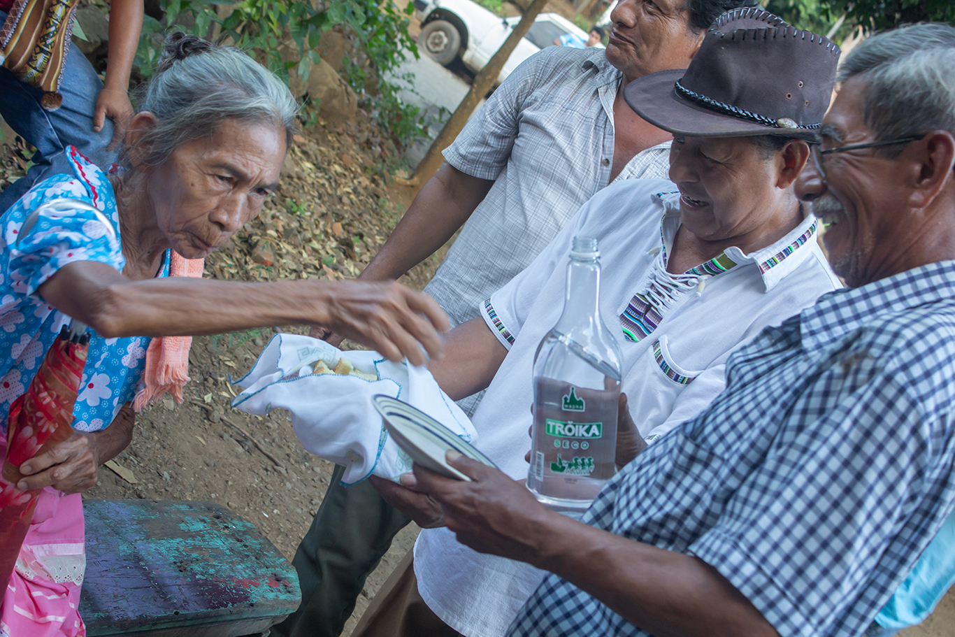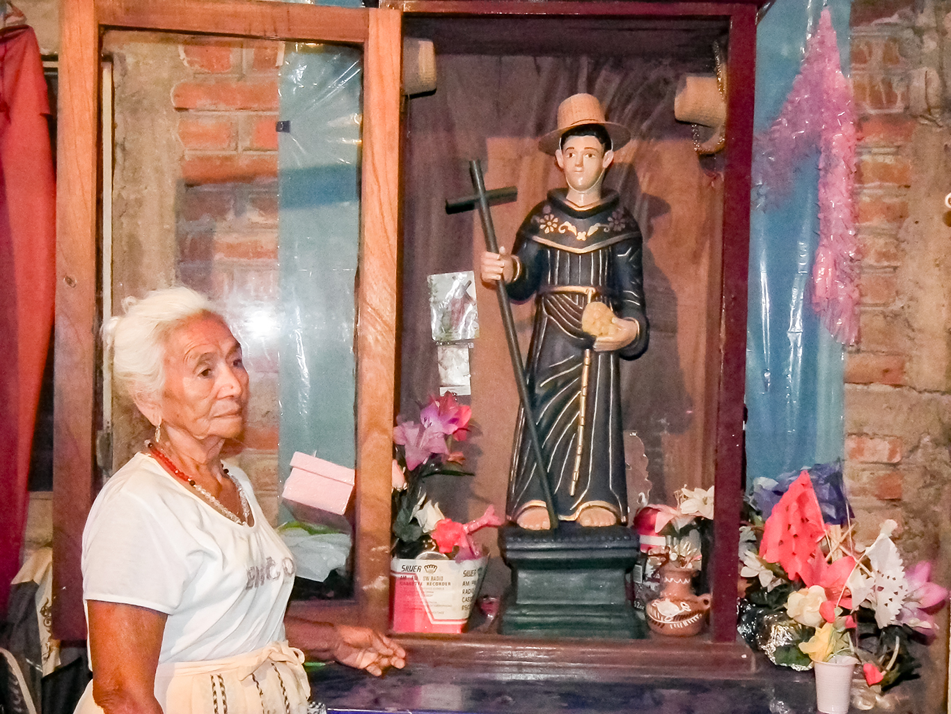 Recuerda que su madre Rosenda Pásin, recibió de su suegra la efigie de San Diego como un regalo pero que, en esos tiempos Rosenda y su esposo Federico Cuadra, nunca celebraron la fiesta. Al fallecer su esposo, se comenzó a celebrado. Tras la muerte de su madre, ella había sido su única Mayordoma; por su edad avanzada la fiesta poco a poco ha ido disminuyendo y su hijo Ex Alcalde del Común “Tito Pasin”, ha quedado de encargado de su rezo. Contaba que antes, el 11 de noviembre desde las 6 de la mañana ya la marimba de arco hacía acto de presencia y que la fiesta era muy concurrida, debido a que se mandaban muchos atributos cuyo cumplimiento era muy eficaz y que la insignia salía a demandar limosnas por todo el barrio. “Traían a la fiesta, palancas de gallinas, cerdos bien adornados con los que se hacía los tamales”. A esas ofrendas aclara, se les llamaba reliquias. El 12 de noviembre San Diego asistía a su Misa Oficial a las 6 de la mañana en el Templo Parroquial de Nuestra Señora de la Asunción, en una procesión muy alegre.
