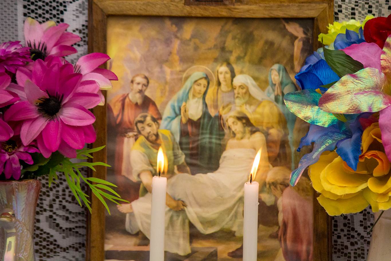 A las 4 de la tarde de ese mismo día, se realiza el respectivo rezo, en donde se reparte los tradicionales tamales y el chocolate a los asistentes. Aunque la pequeña efigie de Cristo es de talla completa, sus devotos le ofrendan túnicas, las que luce siempre puestas, a pesar de que su artífice tallara completamente su túnica y dejara muy bien detallados los pies del Salvador de hombres, dando la sensación inequívoca de “dar el paso”. El Jueves de la Ascensión, también es fecha de fiesta en esta Mesa Altar. Se celebra con un rezo y música de marimba para conmemorar la Ascensión de Cristo a los Cielos.