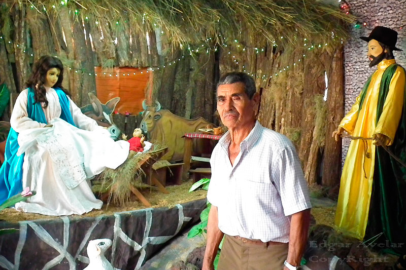Retomando nuestra visita en 2011 al Nacimiento en casa de Alfredo Méndez, cabe decir que inmediatamente tenemos ante nuestros ojos la escena sacra, notado los finos y singulares detalles de su obra. En cada rincón, nos muestra algo digno de admirar por lo que era menester entrevistarlo, para que sea él mismo quien relatara su devoción: “El Nacimiento, tiene que estar listo ya para el Primer Domingo de Adviento; así debe ser”. De esta forma muy seguro de su devoción, inició su relato dejándonos muy en claro que no se trata de algo que se hace sin sentido, sino que esto es parte del vivir acorde a los lineamientos de la Iglesia. Aseguraba que las efigies sacras del Niño Dios, Santa María y San José, eran propiedad de la recordada Carmelita Cea, por lo que calcula que tienen más de 135 años de existencia: “Contaba la Niña Carmelita, que una vez llegó a la puerta de su casa, un chapín a pedirle un vaso de agua y platicando, él le dijo que tallaba imágenes; fue así como con el interés de la señora, le hizo las Imágenes ahí en su casa”. A partir del 7 de septiembre, el ilustre izalqueño comenzaba a pensar en el diseño que había de elaborar cada año y felizmente llevaba ya 45 años ininterrumpidos de “poner El Nacimiento”.