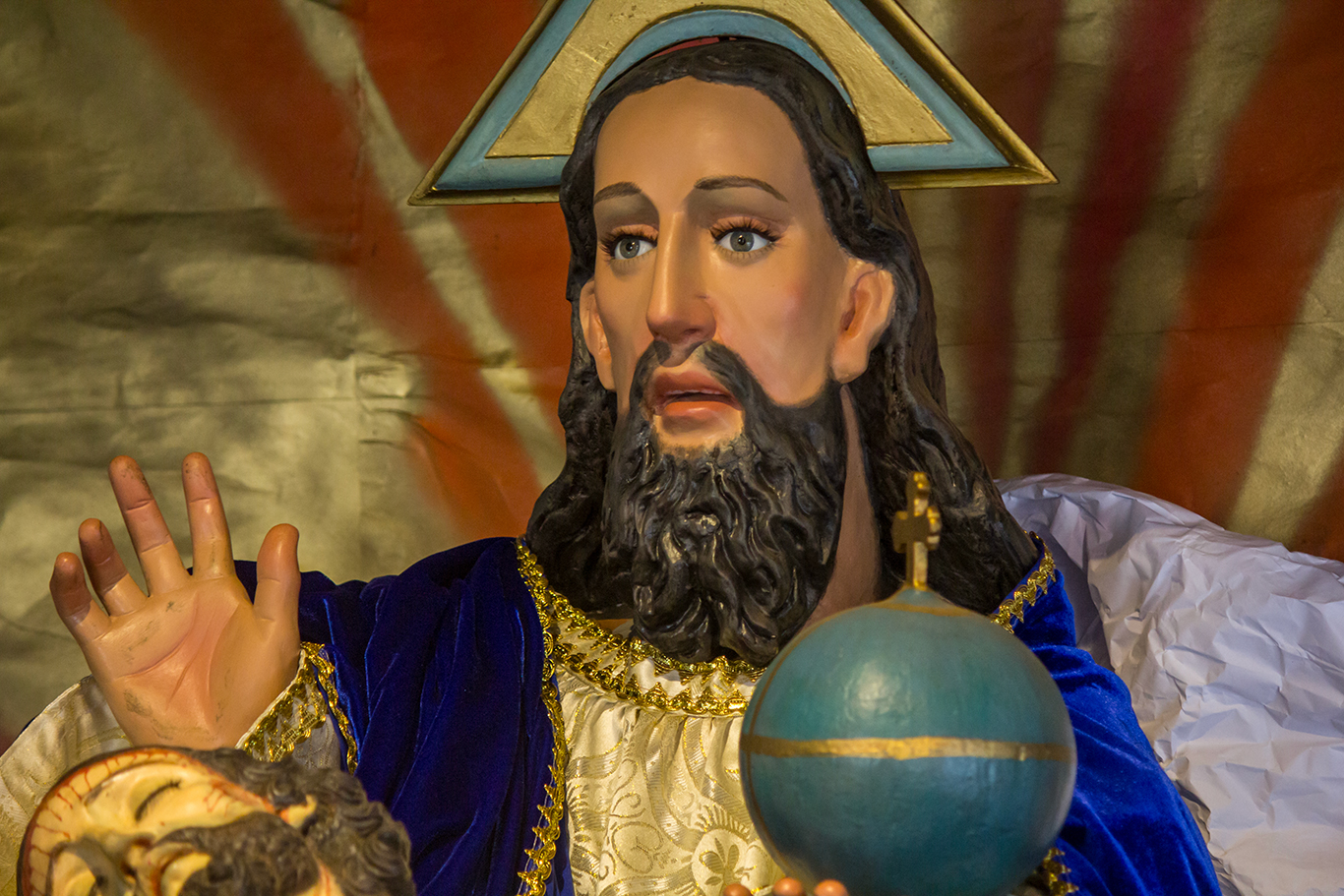 Se puede constatar que muy por el contrario de todo este folclor narrado, la efigie de Dios en este caso nos muestra la simbología típica con el que la Iglesia identifica a la figura de la Santísima Trinidad. Es una Imagen que presuntamente formaba parte de uno de los retablos del Templo de Asunción caído en 1773 al suscitarse el histórico terremoto de Santa Marta; tras el suceso junto a muchas otras Imágenes, fue trasladado al barrio de la Cruz Galana del que ya no regresó. Su busto descansa sobre una nube; nos muestra barba abundante, un triángulo equilátero posa sobre su cabeza –Padre, Hijo y Espíritu Santo-, en su mano derecha sostiene un cetro para gobernar a la humanidad y en su izquierda al mundo -su Creación-.