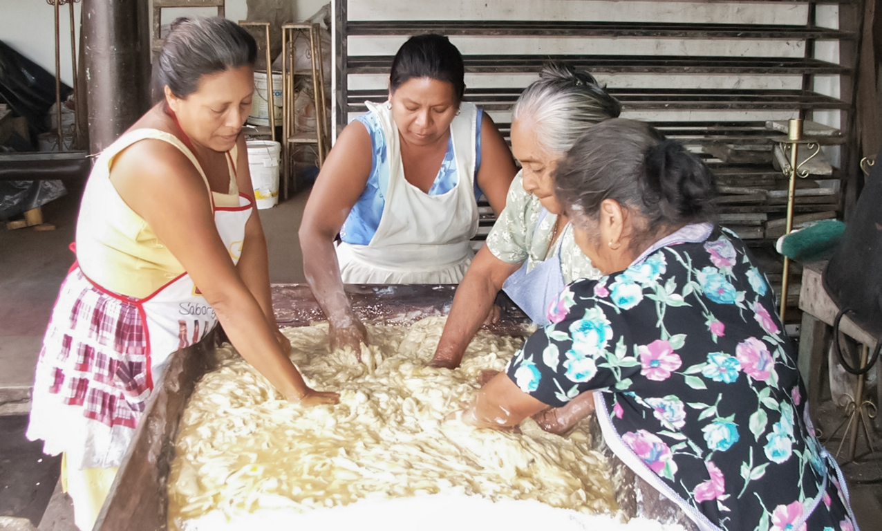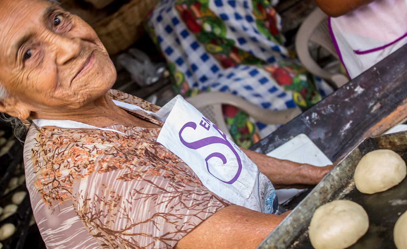 “En aquellos tiempos cuando Rafael Turush era el Mayordomo del Señor, donde estuvo 10 años, recuerdo que el trabajo se hacía en 12 piedras de moler, porque no había horno ni nada moderno para trabajar en la cocina. Ahí comenzó a llegar mi mamá Antonia a preparar la masa para hacer el bollo; para ese entonces ella ya era una panadera experimentada. Cerca del Templo, estaba la panadería de la señora Ildefonsa Castro y ahí se llevaba ya todo listo sólo para hornear. Mi mamá fue la primera panadera que tuvo el Señor; yo tenía como 8 años cuando ella me llevó a la cofradía para que aprendiera y ayudara con el pan. Poco a poco, se fueron incorporando más mujeres. Mi tía Susana era la segunda en jerarquía y ella se quedó cuando mi mamá murió, sin antes hacernos prometerle, que no íbamos a dejar de ir a hacer el pan para Jesús. Cuando ya se hizo el Templo y se trajo al Señor acá, mi tía Susana, Tila Rodríguez y yo, éramos las panaderas y luego vinieron a trabajar Luisa Flores, Rosa Cortez, Sebastiana Sasi, Isabel Quilizapa, Margarita Arucha, Clara Telule, Carolina Najo. Hoy tenemos nuevas colaboras, además de mí, la Niña Chabe y la Niña Clara, también está Diana su hija y las muchachas Morán Lucy y Sindy; nosotras somos el nuevo grupo de panaderas”.