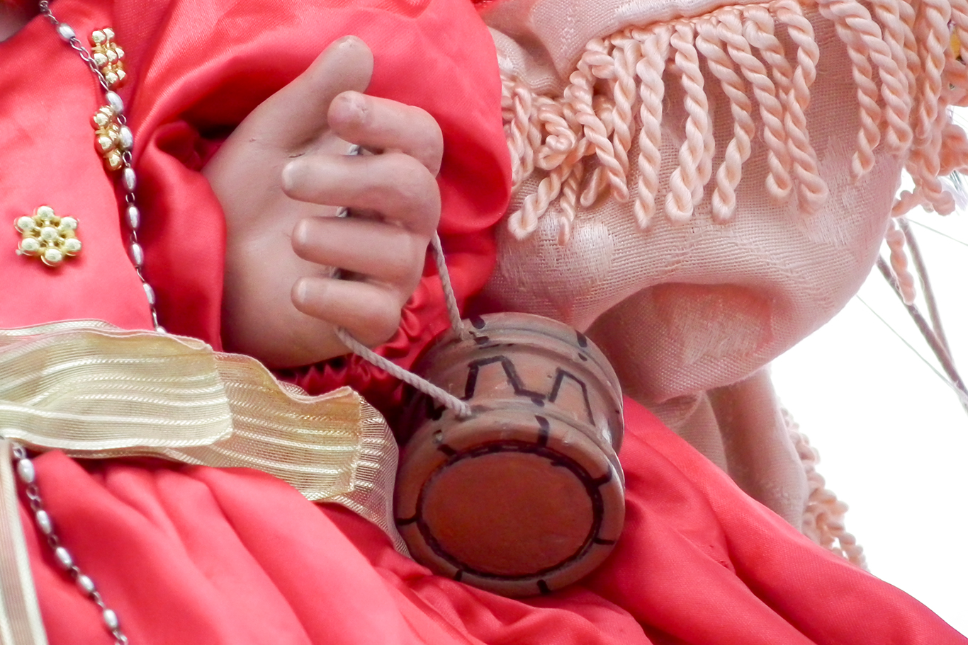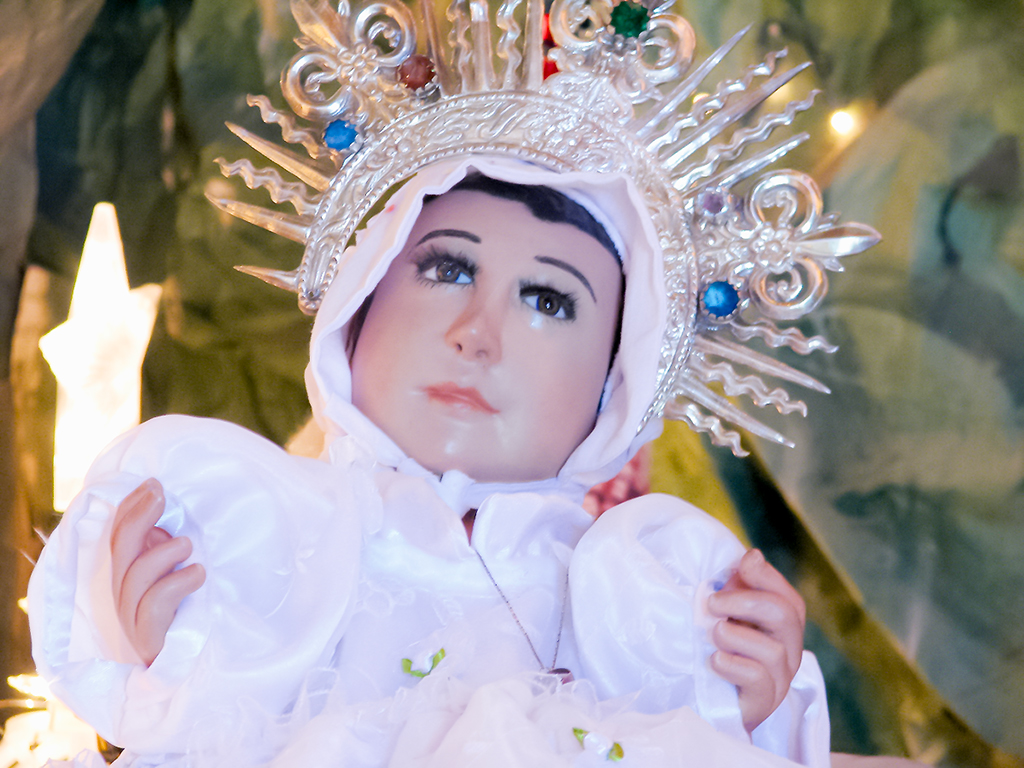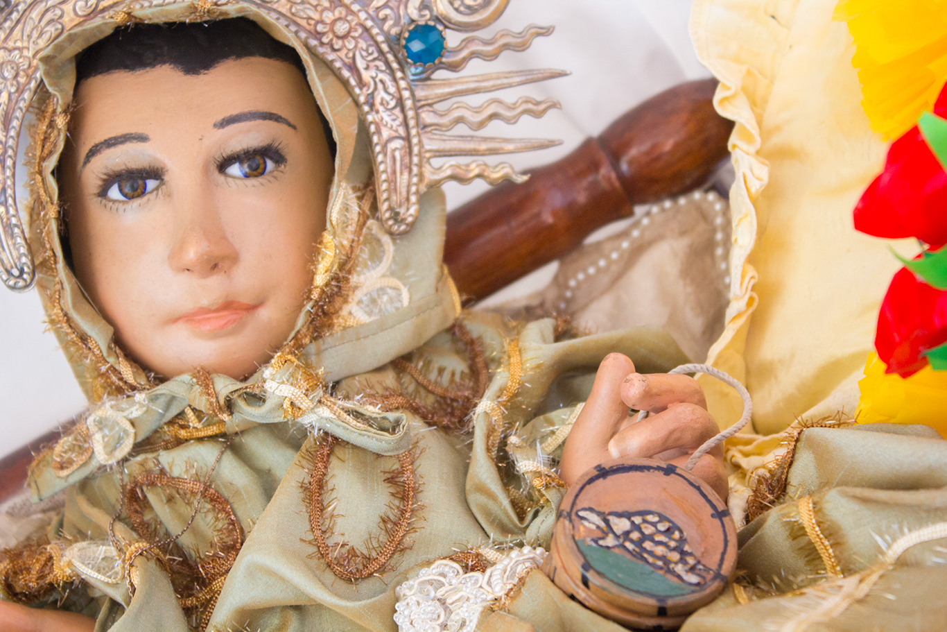Luce su corona colonial de plata con sus 3 Potencias, lo que implica la aportación cristiana para dejar en claro, que Él es la Imagen de Cristo-Niño descartando cualquier otra interpretación que los izalcos pretendan hacer de Él. Pero por su parte, los izalcos le colocan en su manita izquierda o derecha, un pequeño tambor indígena, instrumento que previa conquista, sirviera en los rituales a sus dioses y el “chin chín” de tecomate respectivo como muestra de resistencia cultural. Cosa aún en nuestros días constatable, es que al momento de transitar la “demanda” por las calles de Izalco acompañada de pito y tambor, los lugareños abren la puerta de su casa para recibirlo: se acercan, se santiguan, lo tocan y le hablan, tras darle la respectiva limosna. Previa fiesta, la cofradía reparte los respectivos atributos. La efigie es sujeta de mucha devoción, al punto que cada año estrena “vestido” nuevo, agrega su actual Mayordomo. Ya el 20 de diciembre la Imagen es visitada en su tradicional “Nacimiento” construido en la sede de su cofradía y que ha sido generosamente donado por un devoto. Al frente del lugar de veneración, ha de construirse la “ramada” de rigor, techo centenario adornado con banderitas de papel china, donde el pueblo vive la fiesta. Chocolate, café, pan de bollo y tamales serán el deleite de los lugareños. Durante estos días, la Imagen visita algunos hogares donde es solicitada con el fin de realizarse un rezo con vecinos invitados.