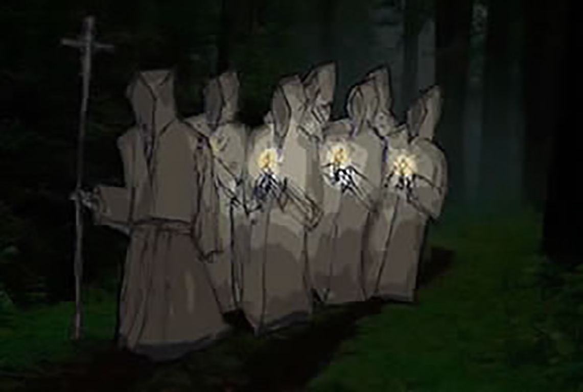 y con los pies descalzos. Cada fantasma lleva una vela encendida. Al frente de esta compañía fantasmal se encuentra