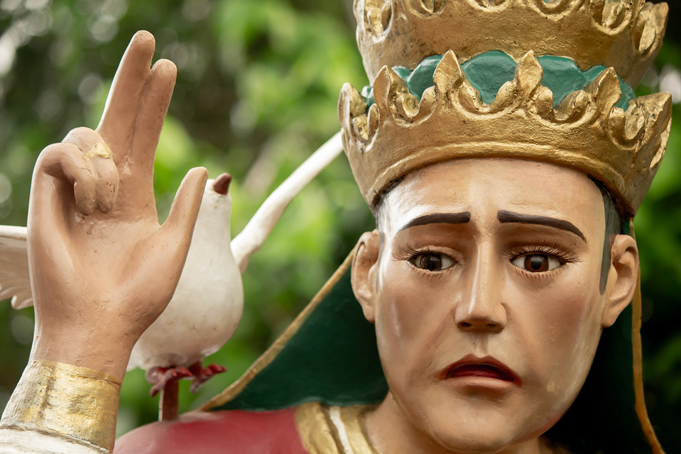 observarse que luce su báculo papal y toda la simbología vaticana. Sobre su hombro derecho, reposa la paloma del Espíritu Santo que lo eligió Papa de